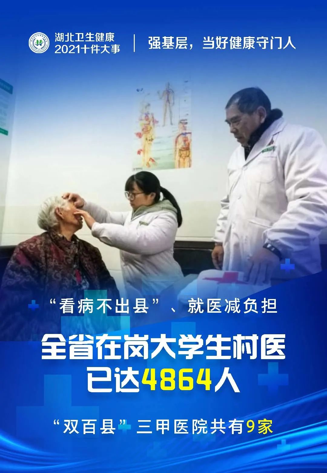“以前就怕生病,开药还要跑到大医院。现在好了,在自家门口就能把病瞧了。”为织牢织密公共卫生防护网,补齐基层医疗机构相对薄弱的“短板”,让村民都有“健康守门人”,在家门口就能享受到三甲医院的服务,2021年,“万名大学生乡村医生配备及县(市)三甲医院建设”列入湖北“我为群众办实事”实践活动“十大惠民、四项关爱”实事项目。我省提出,在2025年实现“一村一名大学生乡村医生”目标,补齐乡镇医生队伍建设短板;加大力度推进百万人口的县(市)和经济百强县创建三甲医院,把医疗资源力量更多向县(市)倾斜,着力建设区域医疗中心。