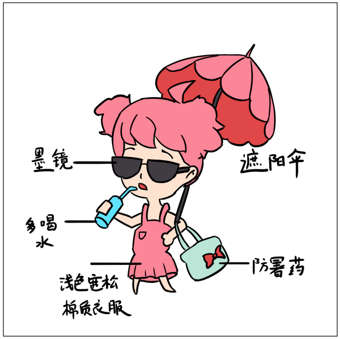 5、外出时戴帽子和太阳镜,或者撑遮阳伞,不要打赤膊,尽量穿浅色、透气性好的衣裤,多补水,随身携带防暑药。