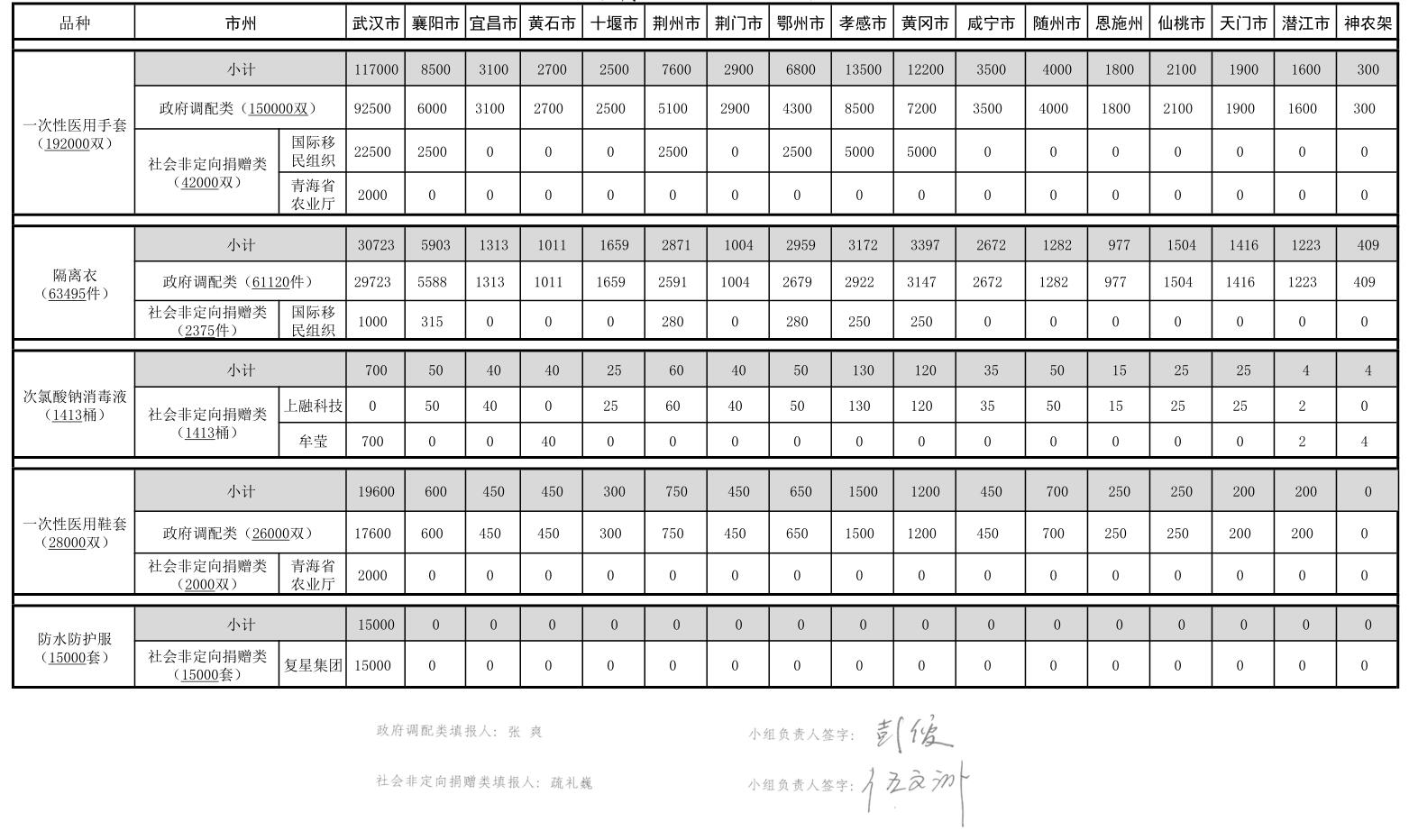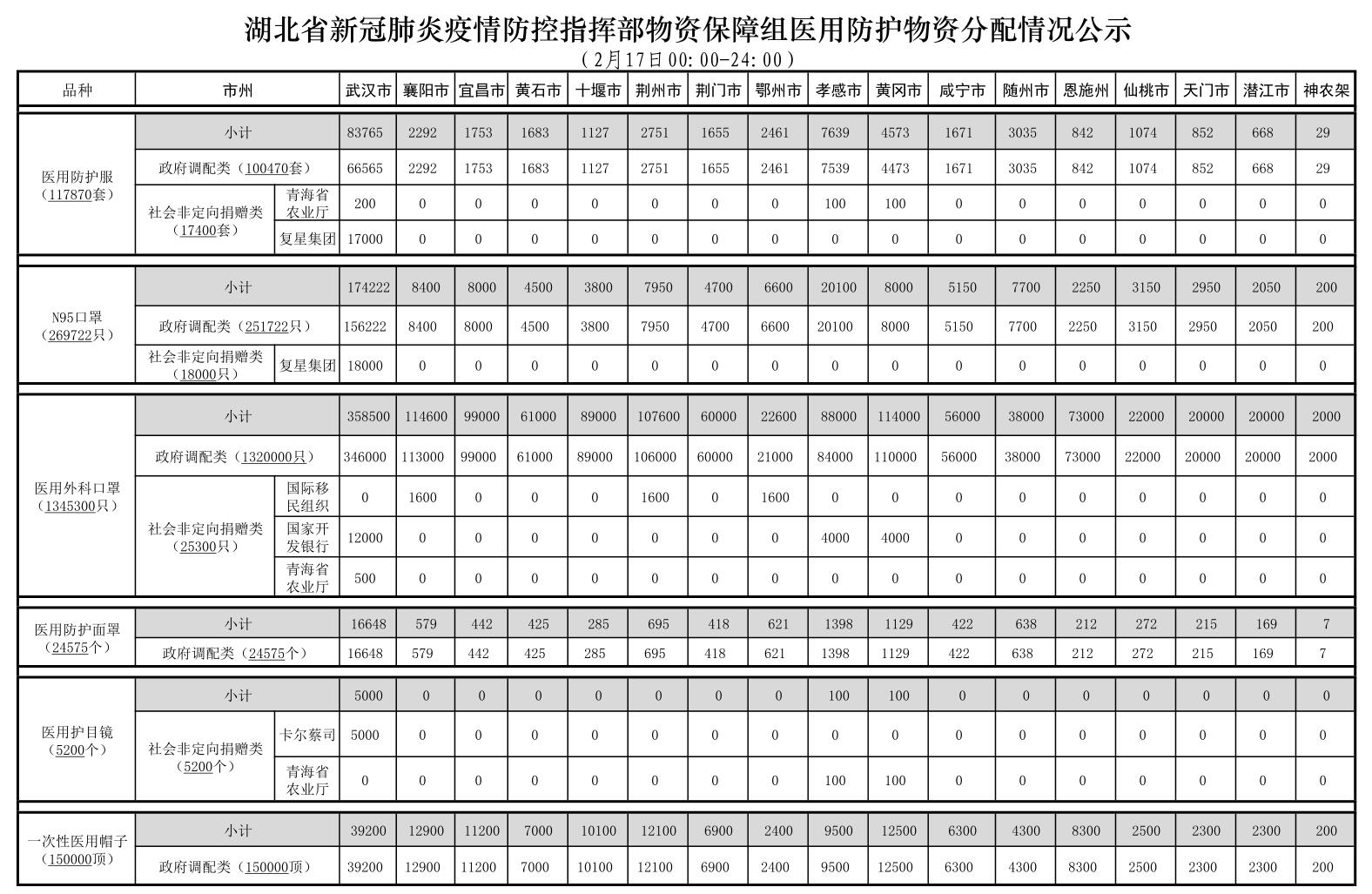 湖北新冠肺炎疫情防控指挥部物资保障组医用防护物资分配情况公示(2月17日)