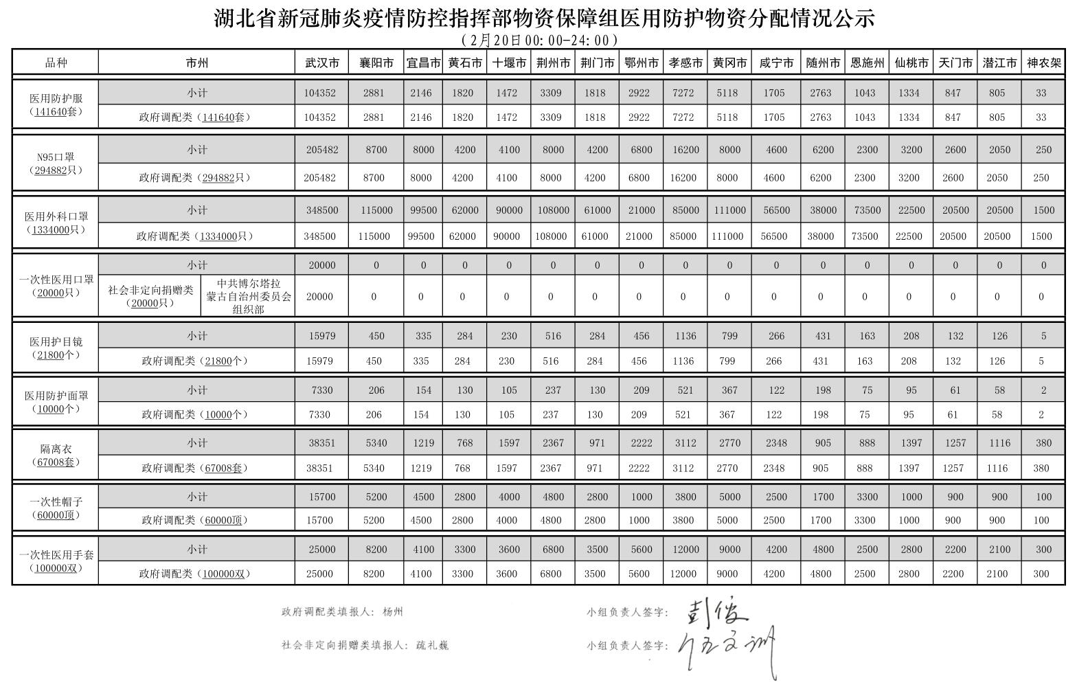 湖北新冠肺炎疫情防控指挥部物资保障组医用防护物资分配情况公示(2月20日)