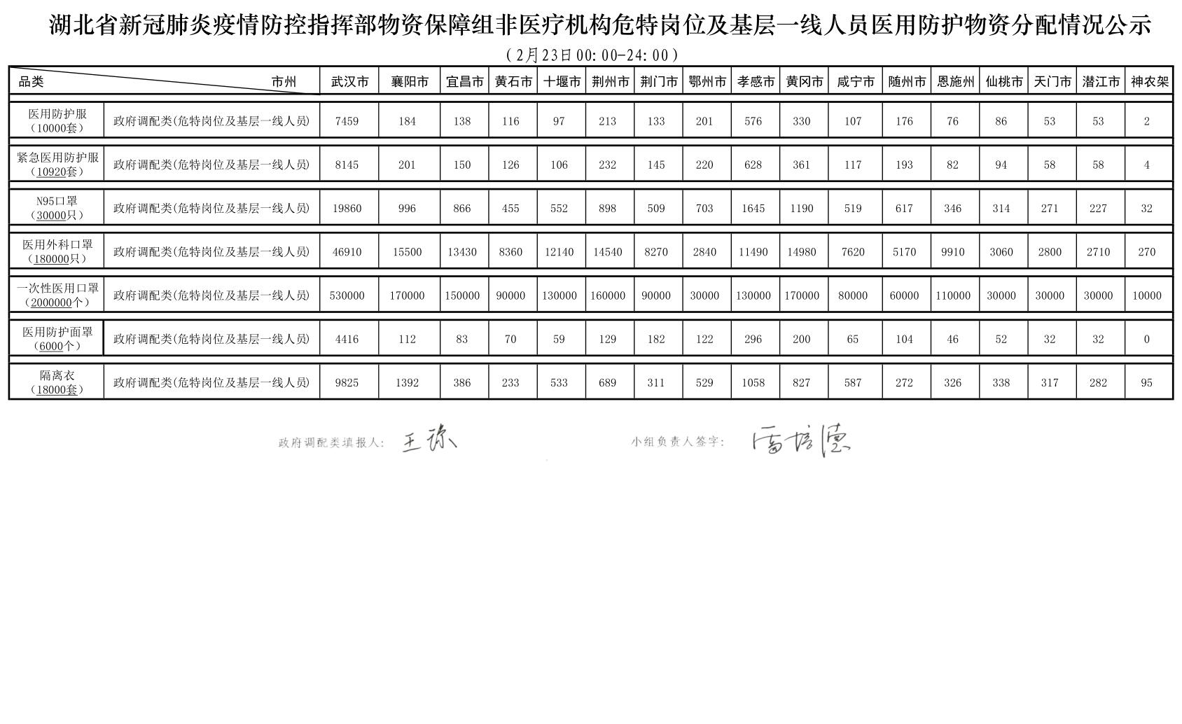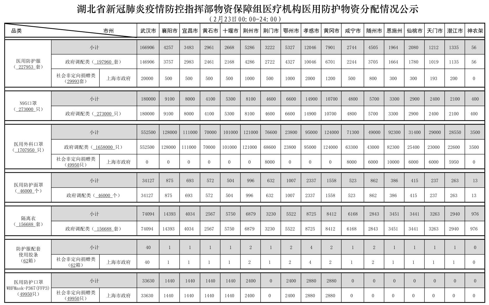 湖北新冠肺炎疫情防控指挥部物资保障组医用防护物资分配情况公示(2月23日)