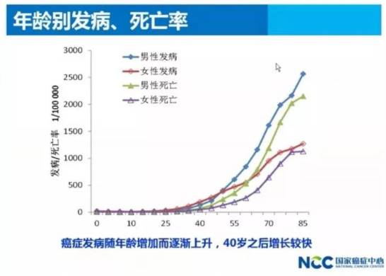 ◆随着年龄的增长,中国男女发病率及死亡率均逐渐上升。
