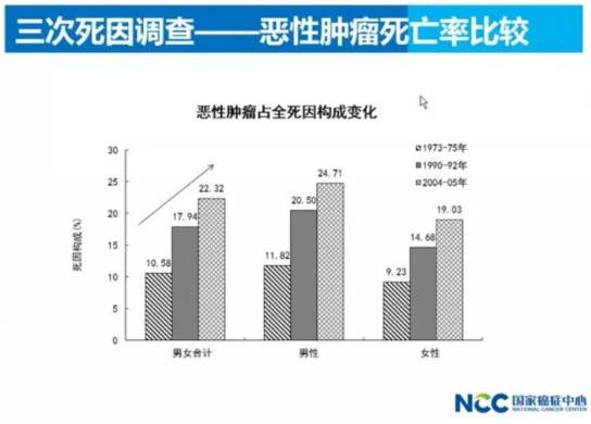 ◆上世纪七十年代、九十年代及本世纪初先后三次中国居民死亡原因调查,不论男性还是女性,恶性肿瘤死亡率均逐渐升高。
