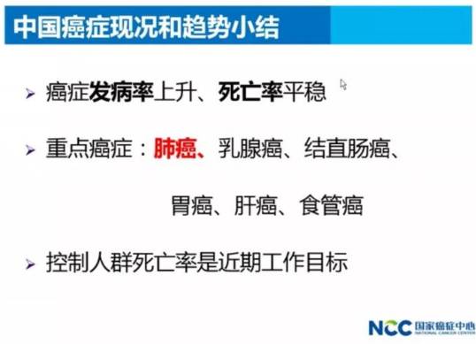 ◆肺癌及乳腺癌分别居我国男性及女性的肿瘤发病首位,消化道肿瘤总体发病率逐年攀升,近期控制人群死亡率是我国近期工作的目标。
