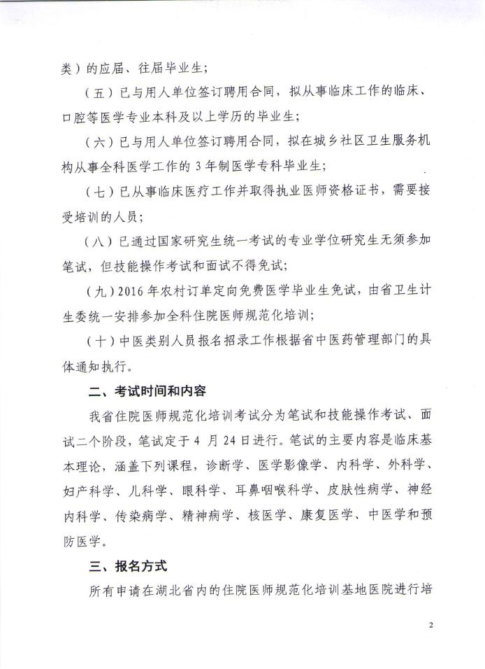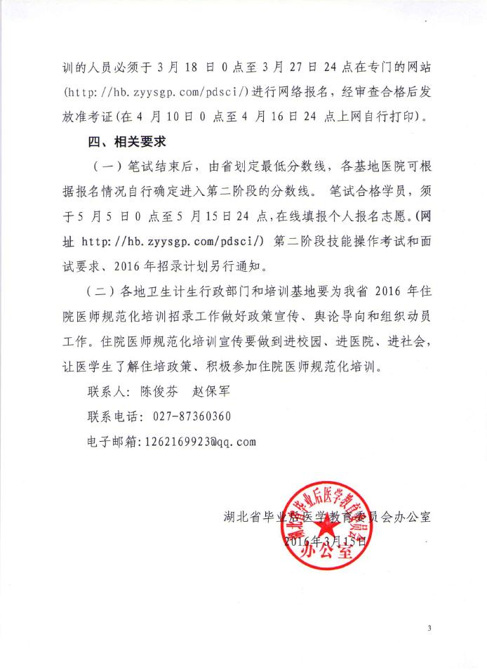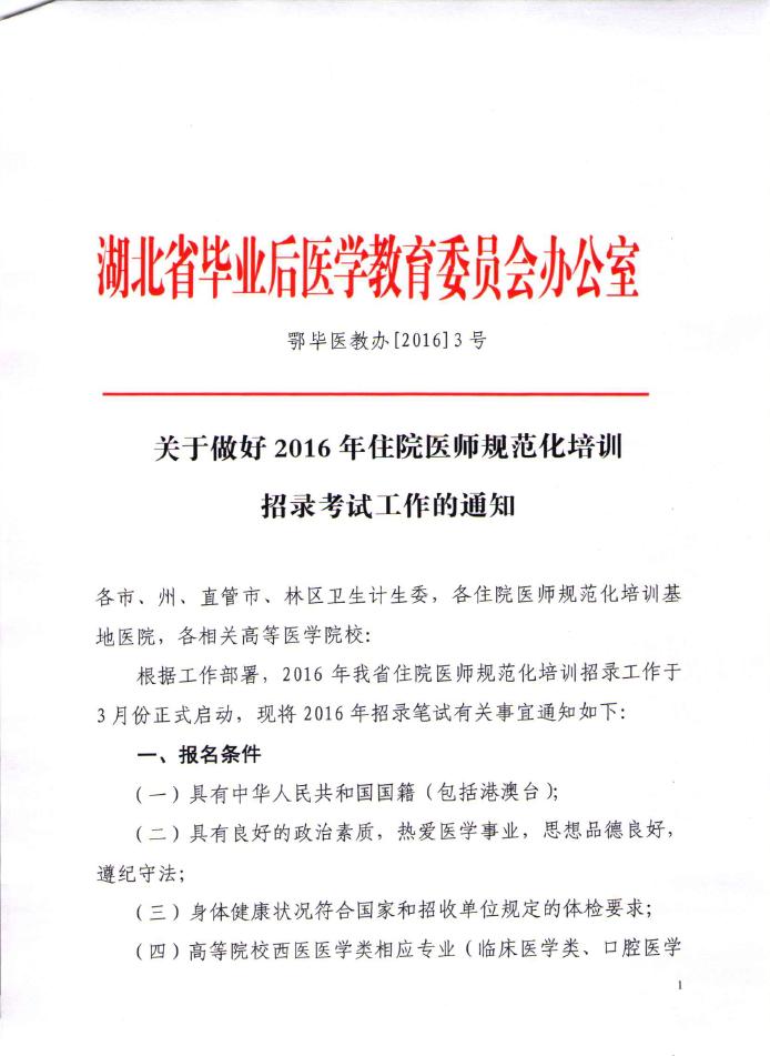 关于做好2016年住院医师规范化培训招录考试工作的通知(鄂毕医教办[2016]3号)