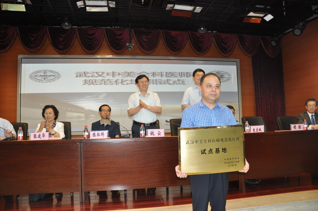 在基地授牌仪式和项目开学仪式上,武汉市卫计委党委书记朱宏斌对项目的实施提出了要求,陈红辉主任介绍了一年来试点项目的整体推进情况。湖北省卫计委副主任姚云要求,武汉市卫生计生委和市普爱医院要通过与美国华人执业医师协会的此项合作,充分学习借鉴国际全科医师培养先进理念和模式,加强全科医学科和基地建设,创新教学模式,引进美国华人执业医师协会师资力量,切实保证培训质量和效果。同时要求在试点工作中,加大创新力度,进行有益探索,认真全面总结,形成可复制、可推广的“武汉经验”,在全省、乃至全国的全科住院医师规范化培训中起到示范作用。美国华人执业医师协会陈枫教授发言,全科医师培训是一项有着非常深远意义的工作,在项目实施中将精心组织,总结经验,力争圆满完成项目任务。