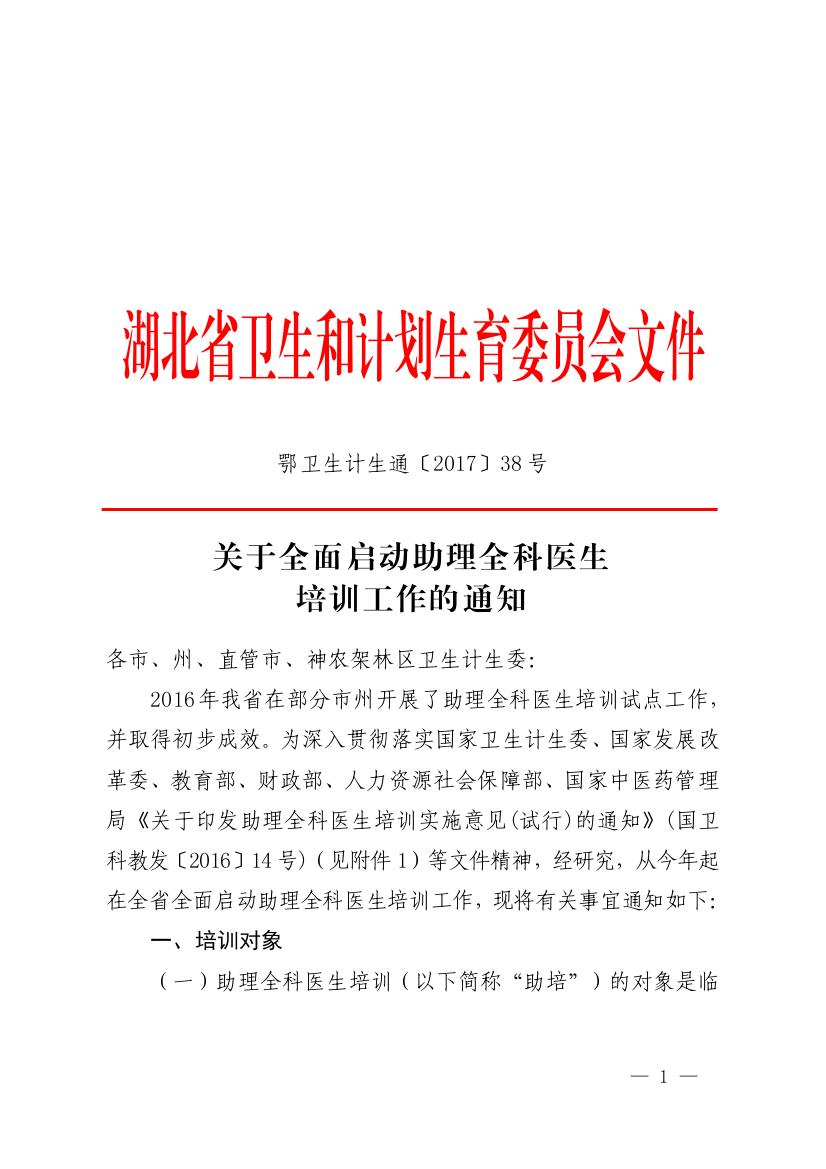 教育管理│关于全面启动助理全科医生培训工作的通知(鄂卫生计生通【2017】38号)