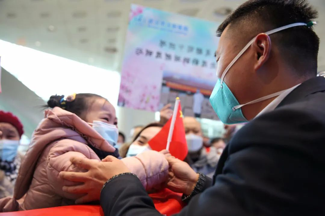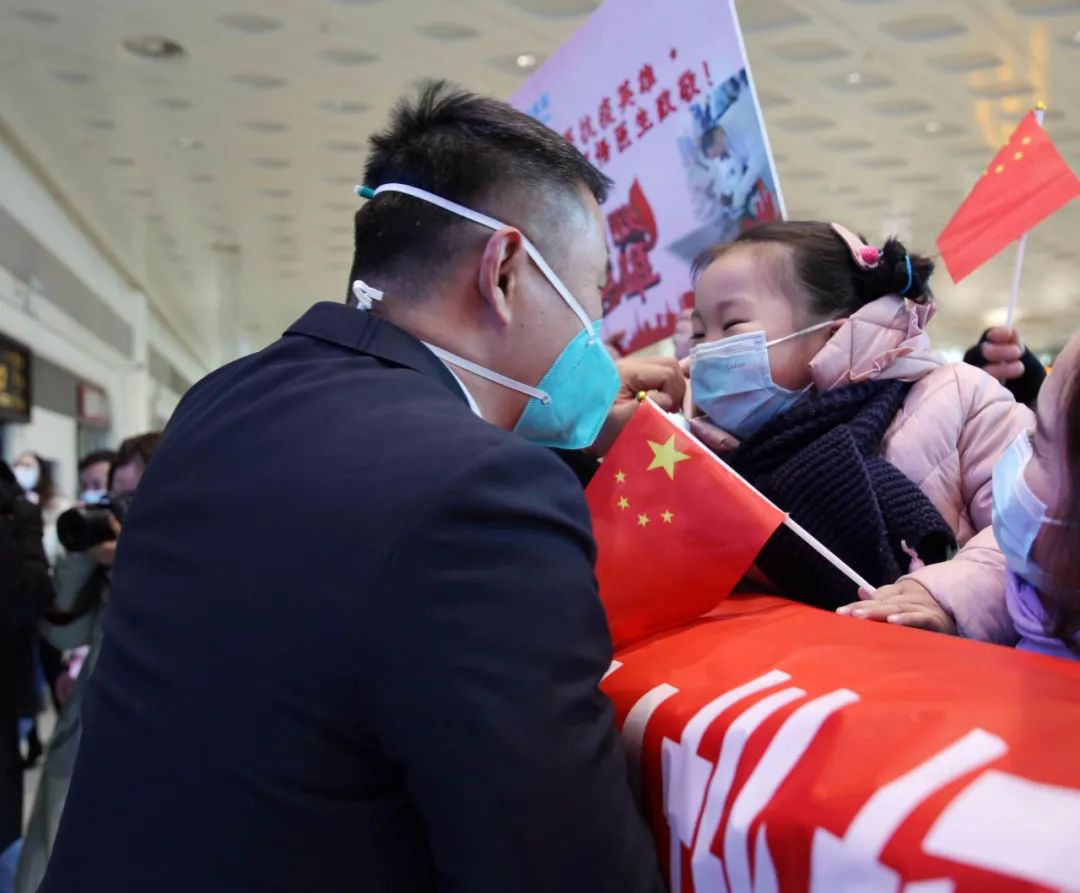 中午1点多,9名医疗队队员走出安检口,前来接机的同事和家属与他们紧紧拥抱。