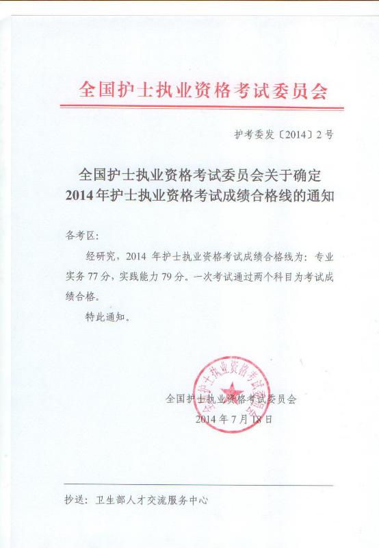 2014年护士执业资格考试合格线通知