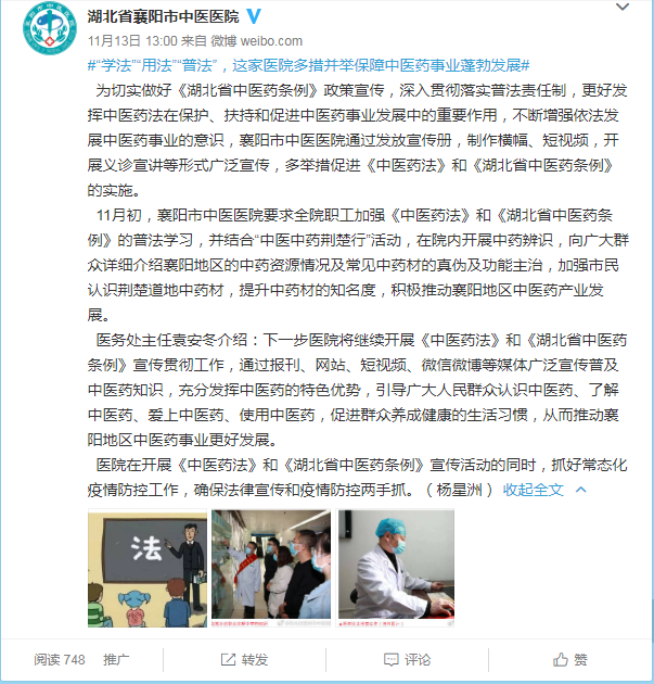 襄阳市中医院利用新闻媒体、电子设备、信息平台宣传《中医药法》、《湖北省中医药条例》具体内容,加强了群众对《中医药法》《条例》的学习,促进群众对中医药知识的了解和认知。