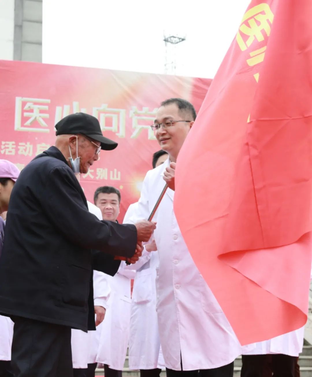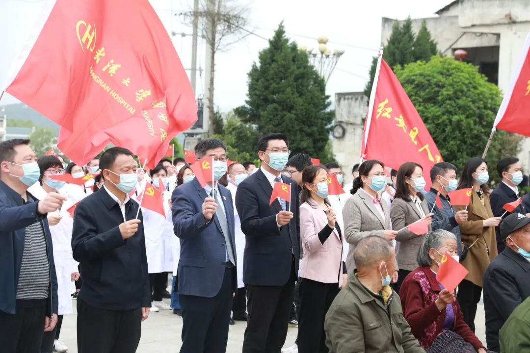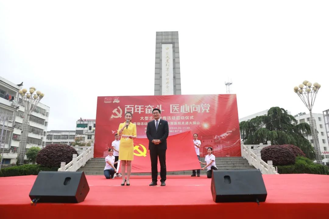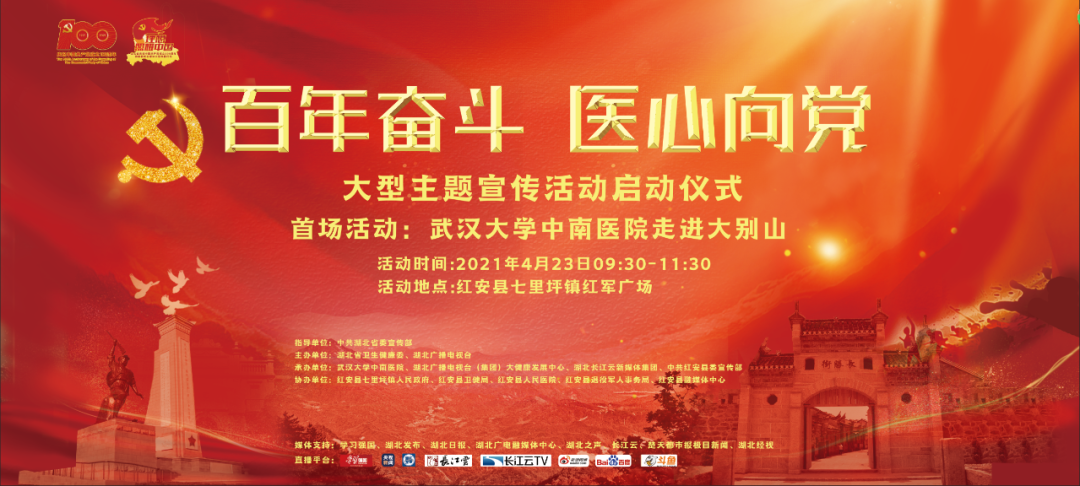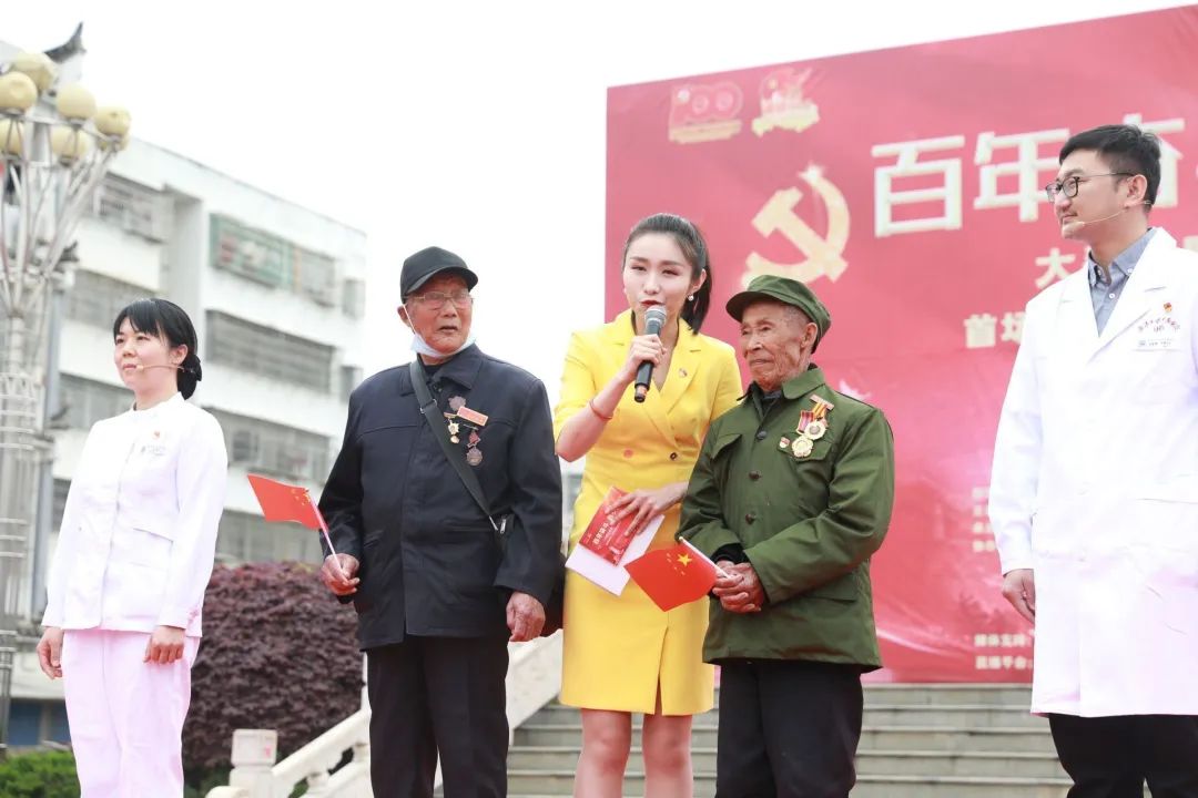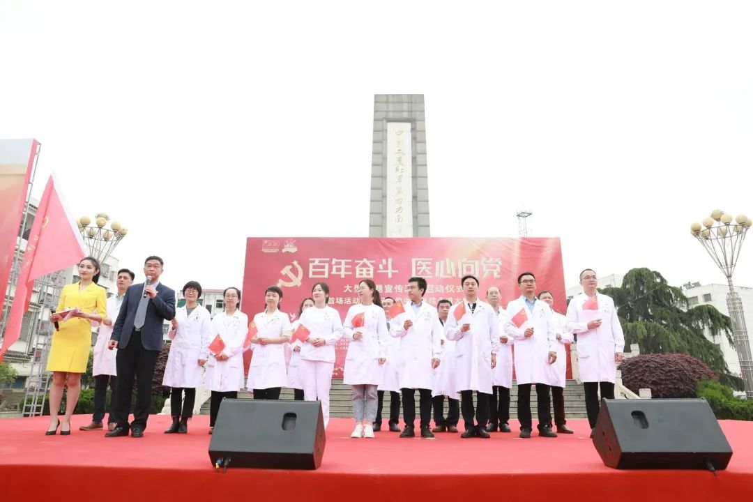 “党的光辉照我心......”4月23日早上九点半,红安县七里坪镇“中国工农红军第四方面军诞生地”纪念碑广场上空回荡着嘹亮歌声。“百年奋斗 医心向党—湖北百医基层行”主题宣传活动正式启动。“我志愿加入中国共产党......为共产主义奋斗终身,随时准备为党和人民牺牲一切,永不叛党。”全体党员在现场一起重温入党誓词,而领誓人,正是一名土生土长的红安党员,他就是“疫情不退我不退!哪里需要我,我就去哪里!”、“中国好医生”、“全国五一劳动奖章获得者”、“湖北省抗疫先进个人”、武汉大学中南医院党委书记、武汉雷神山医院副院长袁玉峰。宣誓毕,五位来自武汉大学中南医院的党员代表和红安老红军代表上台报党龄、说心声、领唱《没有共产党就没有新中国》,一同为党的百年生日献礼。其中,两位高龄红安老红军眼眶湿润地说道:“感谢党,我们能有今天我感到真的很幸福......祝福中国共产党100岁生日快乐!”为做好“百年奋斗 医心向党”的义诊工作,“百年奋斗 医心向党--走进红色大别山”活动特别成立了红色医疗先锋队。在启动仪式上,抗美援朝老兵王克文、聂忠德为红色医疗先锋队代表授旗,并将象征着红色革命精神的火炬,传递给此次义诊行动的队伍代表。此次“百年奋斗 医心向党”活动,是由武汉大学中南医院17位医生联合当地医疗团队,为七里坪的乡亲们义诊,并带来了免费药品发放给今天的患者,为需要帮扶的老军人及家属们捐赠30万元专项扶助基金。95岁的聂忠德是红安的一名复员军人,曾参加抗美援朝上甘岭战役,当过班长,负过伤,他也是义诊现场年龄最大的患者。中南医院的医生为进行测量血压等后,发现聂老血压偏高,还有腹泻等问题。医生将控制血压和治疗腹泻等药物赠给聂老,并嘱咐他按时按量服药,如有其他不适随时复诊。本活动由中共湖北省委宣传部指导 ,湖北省卫生健康委员会、湖北广播电视台主办,武汉大学中南医院、湖北广播电视台大健康发展中心、湖北长江云新媒体集团、中共红安县委宣传部承办。
