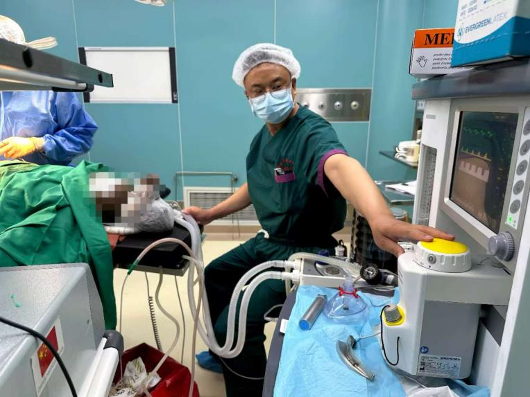 面对患者极度肥胖、饱胃且伴有肠梗阻的复杂病情,麻醉风险极高,术中极易发生呕吐误吸,甚至危及生命。唐钰充分评估并制定了周密的麻醉方案。他采用快速顺序诱导气管插管全身麻醉,并在药物推注完毕后立即实施环状软骨压迫,有效抑制了胃内容物反流,成功预防误吸,为手术的顺利进行奠定了坚实基础。