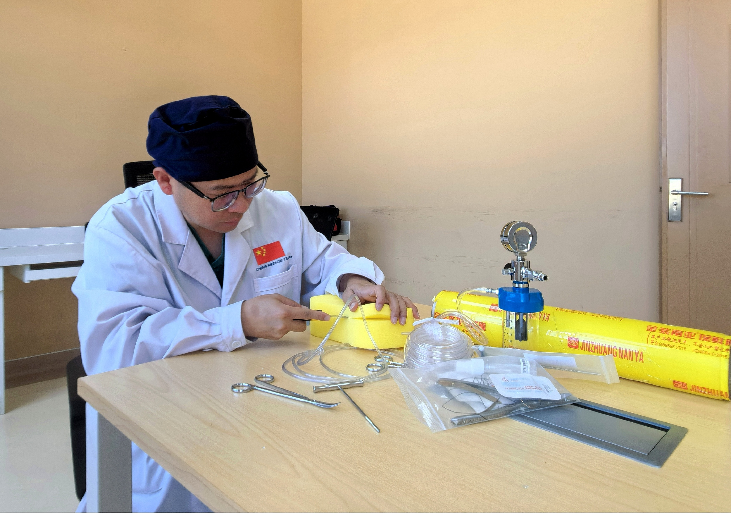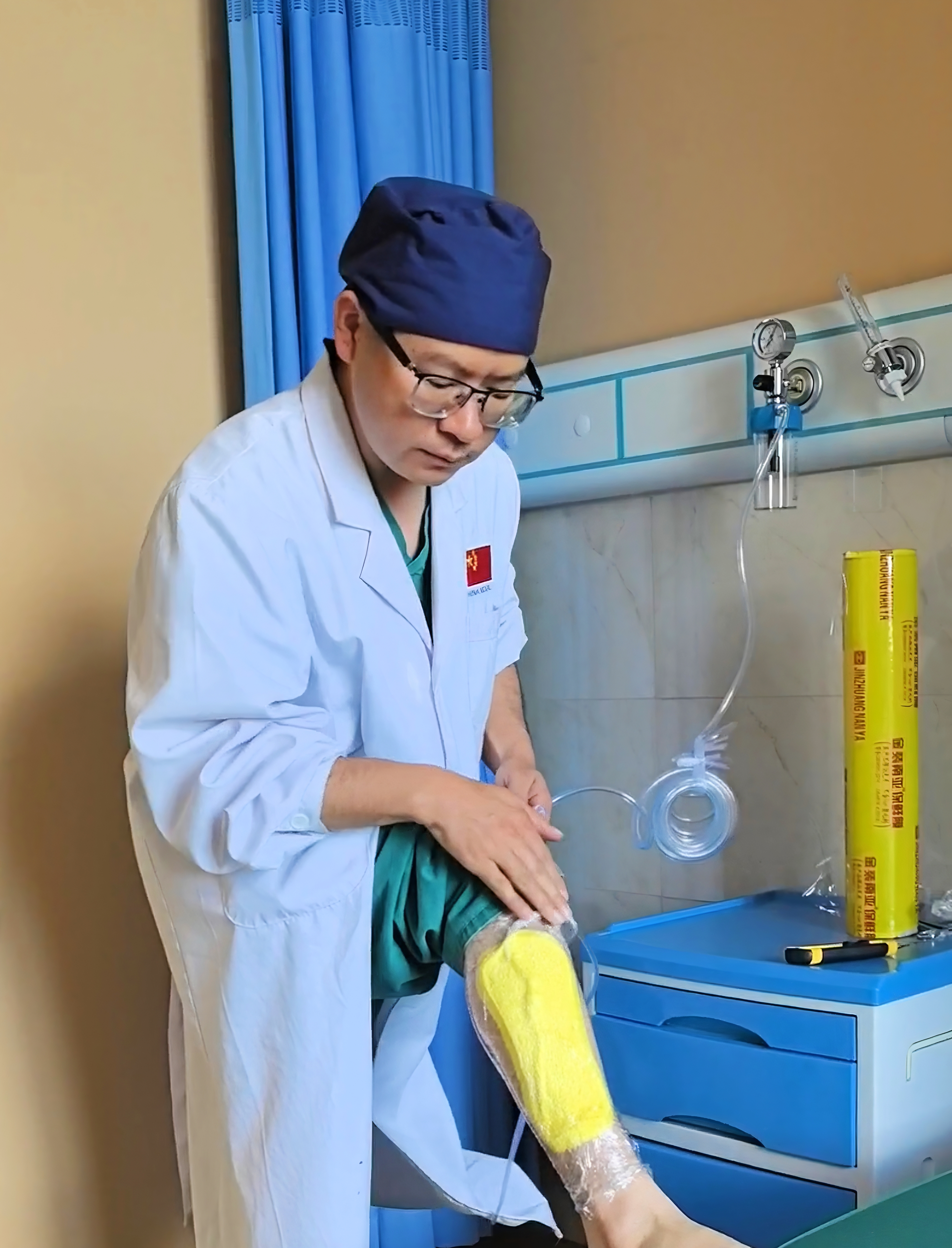 莱索托当地创伤病患较多,开放性骨折并软组织缺损的情况尤为常见。由于医疗资源匮乏,标准负压封闭引流装置难以获取,给创伤修复工作带来极大挑战。面对这一难题,中国医疗队队员、武汉中西医结合骨科医院(武汉体育学院附属医院)骨科副主任医师左昌俊因地制宜,创新性地利用洗车海绵、保鲜膜、吸氧管等简易材料,自制了一套负压封闭引流装置。该技术装置将伤口内的渗液、坏死组织和细菌持续、可控地吸出体外,使用一周后观察,患者伤口状况明显改善。