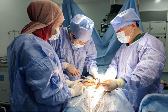 麻醉科队员陈红密切配合,快速对病人进行麻醉。潘欣以最快的速度进入患者腹腔,发现腹腔内已有暗红色积血。她对腹腔积血进行清除后,探查子宫切口情况,在该处见一个大小约2cm的破裂口,破口处及周围一直在冒血,血如泉涌。潘医生用钳子夹住出血点,清除部分组织后,出血得到明显的控制,但她同时也发现一个比较棘手的问题:妊娠组织已植入到子宫下段的疤痕内,这些组织无法从子宫下段成功剥离,属于典型的切口妊娠。此时,我也及时赶到了手术室。我上台后,快速对病情进行了评估,患者的切口处仍然有出血,植入情况比较严重,但要想尽一切办法保住病人的子宫。我与潘欣进行商量,先用棉垫压住创面,决定行髂内动脉结扎,我们默契配合,几分钟内便完成动脉结扎。随后,分离与瘢痕处粘连的膀胱,充分暴露子宫下段后,剪除植入的疤痕组织并彻底清除妊娠组织,最后对创面进行缝合。手术不到一个小时便顺利结束。阿国医护人员对中国医生准确判断病情并第一时间进行手术成功抢救的举动竖起大拇指。